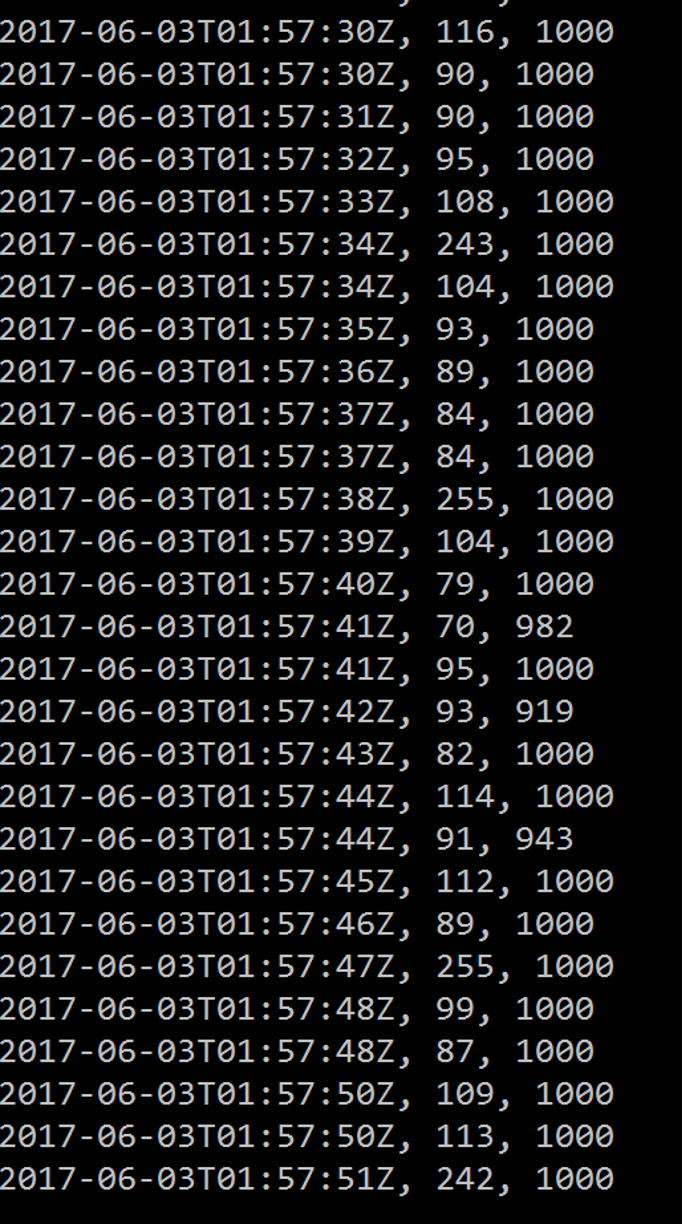 In the following screenshots, you’ll see rows with three values: the first value is the timestamp of the row insertion batch (remember, each batch contains up to 100 rows), the second value is the ellapsed time for inserting the batches in milliseconds, and the last value is the total amount of rows inserted.